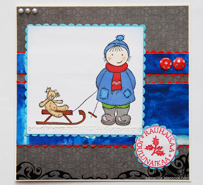 Harmaa kuviopaperi löytyi silppulaatikosta ja riitti juuri korttiin kun sopivanlevyisiä suikaleita siitä leikkeli. Alalaidan mustat kiekurat olivat paperissa valmiina. Sininen kartonki kierrätystä; alunperin joku EU-aiheinen mainospostikortti, jossa kaksi eläinhahmoa kulkee ulkosalla ...eläimet jäivät kivasti piiloon leimakuvan alle ja suikaletekniikalla sininen tausta valkoisine lisineen ajaa kortissa kuviopaperin aseman. Teksti Stempelkellerin ja luonnoksen mukaisesti pari card candya koristeeksi ja loppusilauksena vielä muutama valkoinen puolihelmi nurkkaan.