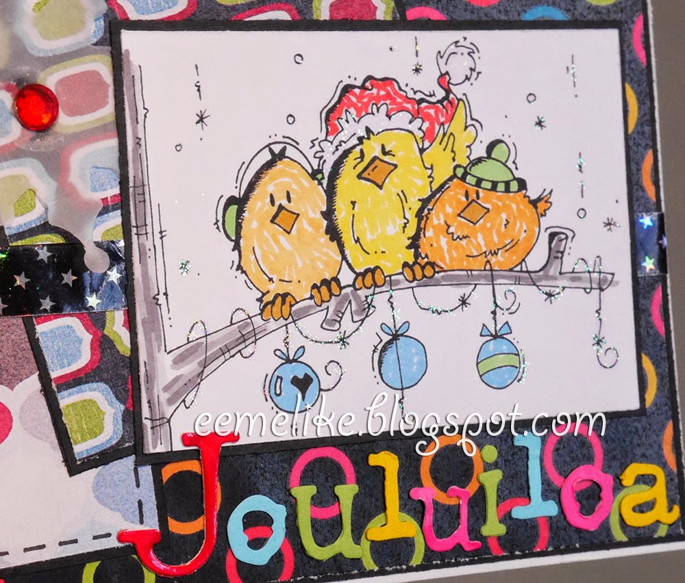 Bugaboo digi stamp is colored with ProMarkers and I embossed some bling effect on it with holographic embossing powder (by Ranger). Designer papers are all digital ones - from ToutAimee (bottom), Cinnamon Scraps (left side) and Shuckclod's Stuff (smallest piece, behind the image). Metallic-looking ribbon is a lucky star -"ribbon", snowflake is cut with a Crealies die out of tracing paper and it has a 6 mm sized rhinestone in its center. Letters, that form "Christmas Joy" (in Finnish), are cut with Sizzix dies (typeset and wingo zingo alphabet), and for finishing touch I doodled some fake-stitching on one of the designer papers.