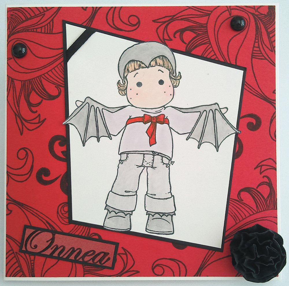 Leimakuva on siis vaihdosta tullut, väritetty öljypastelliväreillä ja siipiin laitettu lisukkeeksi pinkkiä kimalleliimaa. Pohjalla lomaviikon kirpparilöytönä hankittu ruusutapetti, joka on mielestäni todella kaunista ja en sitä halunnut kovin paljoa peittää. Onnitteluteksti myöskin saatu joskus joltain ja kukat itse tehtyjä. Molempiin näihin suihkuttelin myös mistiä, jotta väri hieman muuttui ja ennenkaikkea pintaan tuli kaunis kimallus. Pinkki jalokivi vielä kulmaan antamaan viimeisen silauksen.