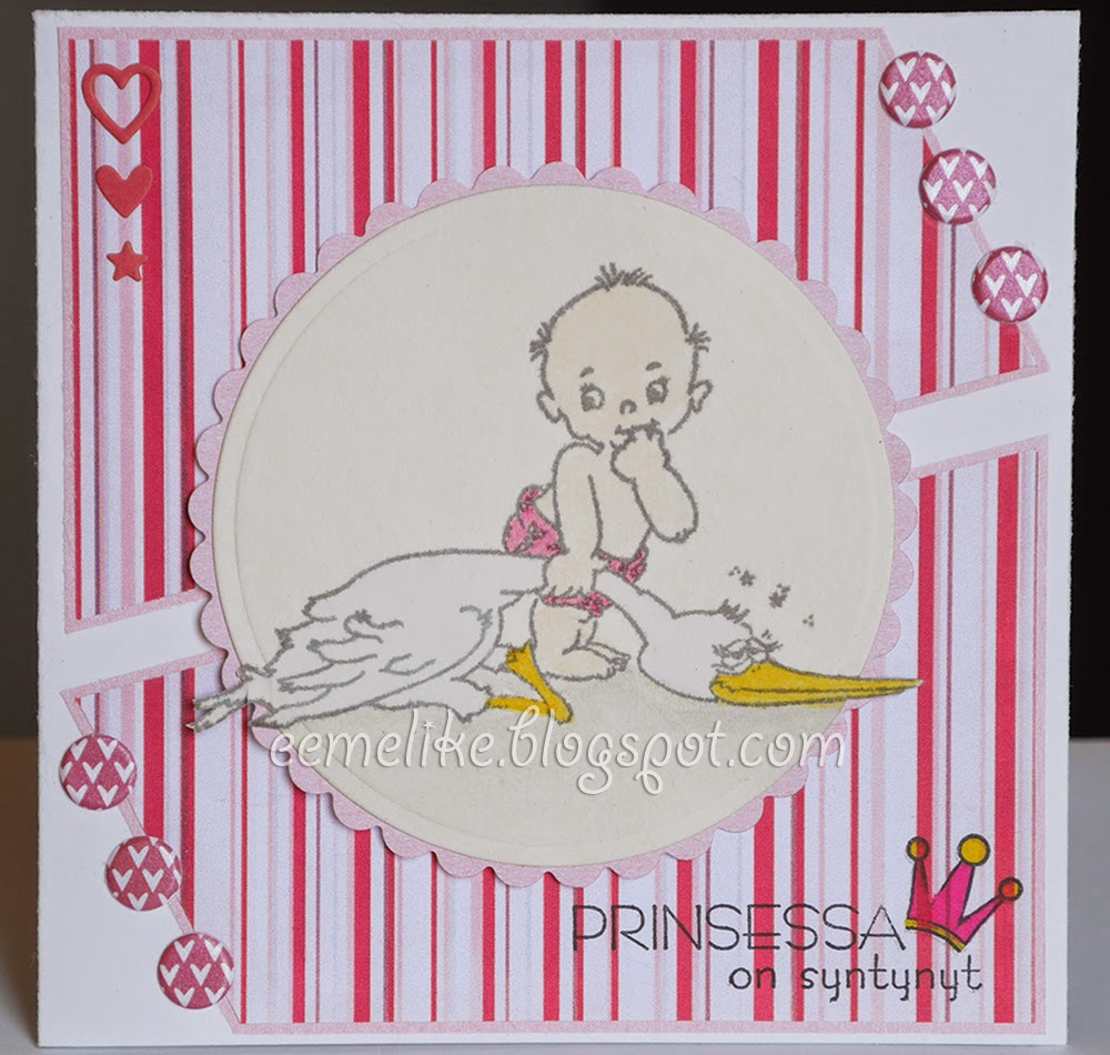 Bugaboo digi stamp is colored with ProMarkers and I embossed some bling effect on it with holographic embossing powder (by Ranger). Designer papers are all digital ones - from ToutAimee (bottom), Cinnamon Scraps (left side) and Shuckclod's Stuff (smallest piece, behind the image). Metallic-looking ribbon is a lucky star -"ribbon", snowflake is cut with a Crealies die out of tracing paper and it has a 6 mm sized rhinestone in its center. Letters, that form "Christmas Joy" (in Finnish), are cut with Sizzix dies (typeset and wingo zingo alphabet), and for finishing touch I doodled some fake-stitching on one of the designer papers.